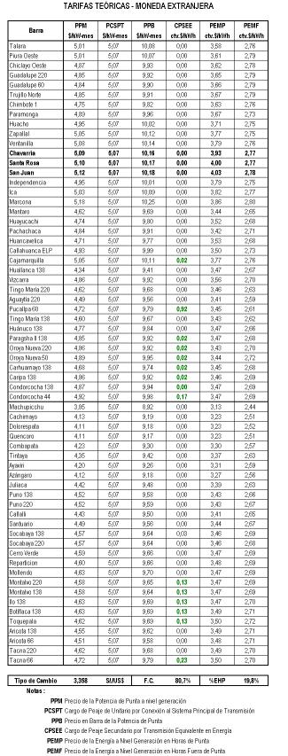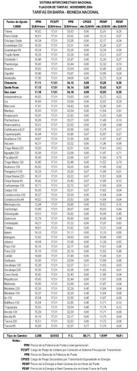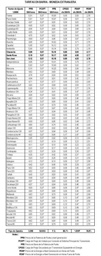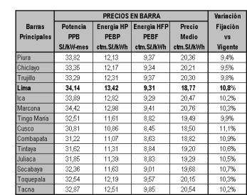 Como resultado de la comparación de precios libre / teórico, se observa que el precio promedio ponderado teórico no difiere en más del 10% de su equivalente del mercado no regulado. Por tal motivo, no es necesario efectuar el reajuste en los precios teóricos para constituir las Tarifas en Barra definitivas. En consecuencia, los precios resultantes para la regulación de Tarifas en Barra del Sistema Eléctrico Interconectado Nacional (SEIN) se resumen en el cuadro siguiente[3]: