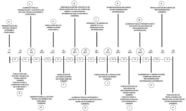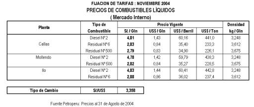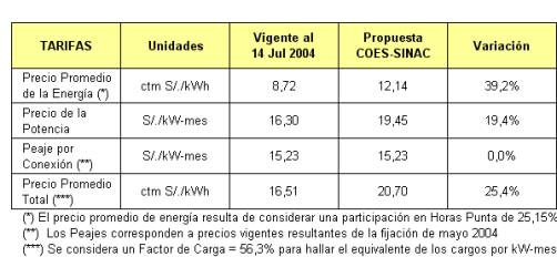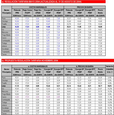El proceso de regulación tarifaria se inició el 14 de julio de 2004 con la presentación del “Estudio Técnico Económico de Determinación de Precios de Potencia y Energía en Barras para la Fijación Tarifaria de Noviembre de 2004”, preparado por el COES-SINAC y remitido al OSINERG para su evaluación. Como parte del proceso regulatorio se convocó la realización de una audiencia pública, la cual se llevó a cabo el 23 de julio de 2004. En esta audiencia el COES-SINAC tuvo la oportunidad de sustentar su propuesta de fijación de tarifas, recibió los comentarios y observaciones de los asistentes y dio una primera respuesta a las observaciones recibidas.