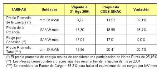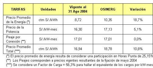 2) El impacto de la tarifa sobre el consumidor final de tipo residencial en el SEIN varía de +4,3% a +5,3%, dependiendo del nivel de consumo, y considerando el efecto de los factores de pérdidas y economías de escala de distribución, vigentes a partir del 01 de noviembre de 2004.