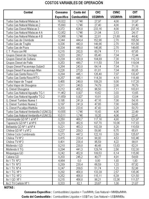 · Para el caso del Costo Variable No Combustible de las unidades de la central termoeléctrica de Ventanilla se utilizan los valores de 4,059 US$/MWh para el caso en que operen con gas natural en ciclo simple y de 2,785 US$/MWh para el caso en que operen con gas natural en ciclo combinado. De igual modo, respecto del Costo Variable No Combustible de la central termoeléctrica de Ilo1 se utilizan los valores de 1,934 US$/MWh para la unidad IloTV2, de 1,325 US$/MWh para la unidad IloTV3 y de 1,231 US$/MWh para la unidad IloTV3. Dichos valores resultan del análisis de la información presentada por el COES-SINAC tanto en su ESTUDIO como en la ABSOLUCIÓN de las observaciones del OSINERG (ver Anexo C).