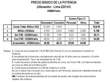 El precio básico de la potencia, de acuerdo con el mandato del Artículo 47°, literales e) y f) de la Ley, corresponde a los costos unitarios de inversión y costos fijos de operación de la unidad de generación más adecuada para suministrar potencia adicional durante las horas de máxima demanda anual, incluida su conexión al sistema de transmisión.