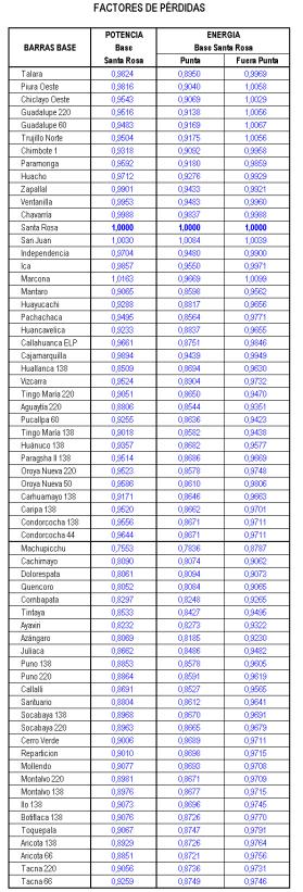 Los precios en barra mostrados en las secciones anteriores, se obtienen a partir de la propuesta del COES-SINAC con las modificaciones efectuadas por el OSINERG. La siguiente relación describe los principales cambios incorporados: