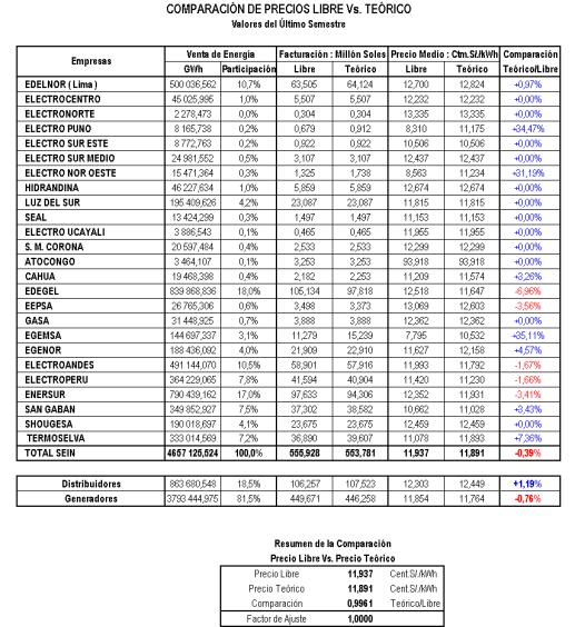 Los precios (teóricos) determinados a través de los modelos de optimización y simulación fueron comparados con los precios libres de conformidad con lo dispuesto por el Artículo 53º de la Ley y Artículo 129º del Reglamento. La información de clientes libres fue suministrada por las empresas generadoras y distribuidoras. Para este fin, se ha tenido en cuenta, además, lo dispuesto por el Reglamento para la Comercialización de Electricidad en un Régimen de Libertad de Precios, aprobado mediante Decreto Supremo N° 017-2000-EM del 18 de setiembre del año 2000.