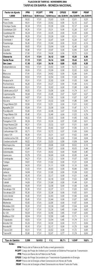 El siguiente informe contiene el estudio realizado por el Organismo Supervisor de la Inversión en Energía (en adelante “OSINERG”), para la fijación de Tarifas en Barra del período noviembre 2004 – abril 2005. Para su elaboración se ha considerado el estudio técnico económico presentado por el Comité de Operación Económica del Sistema Interconectado Nacional (en adelante “COES-SINAC”) de acuerdo con el Artículo 119° del Reglamento de la Ley de Concesiones Eléctricas, los estudios desarrollados y/o encargados por la Gerencia Adjunta de Regulación Tarifaria del OSINERG (en adelante “GART”) sobre el particular.