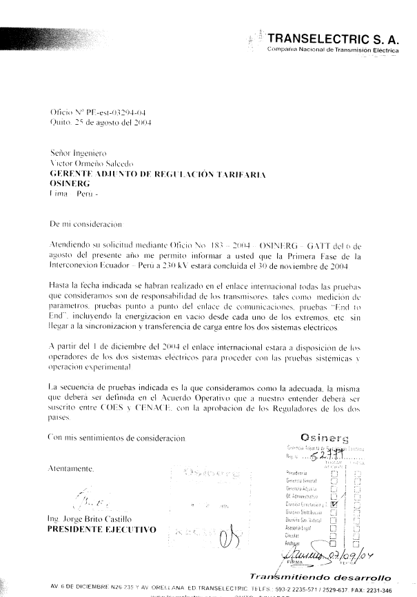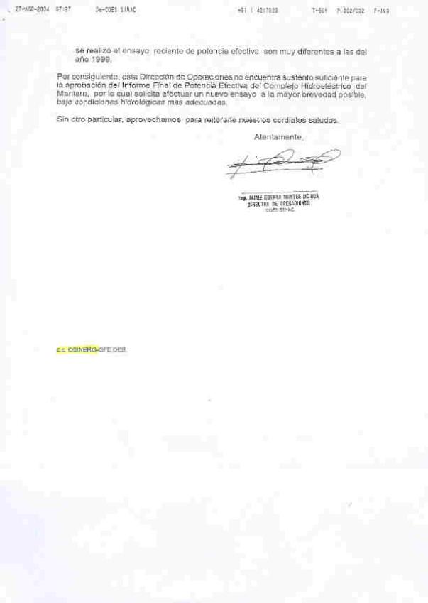 [13] Cartas GOEA/531-2004 de fecha 21.07.04 y COES-SINAC/D-750-2004 de fecha 03.08.04 (folios 879 y 880 de la ABSOLUCIÓN).