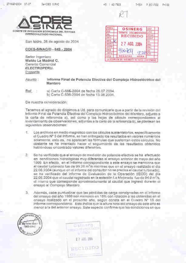 Posteriormente, el 09 de agosto de 2004, el OSINERG remitió al COES-SINAC un informe con las observaciones encontradas al Estudio Técnico Económico señalado anteriormente.