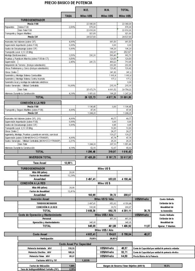 m) Se obtiene el Precio Básico de la Potencia a partir del análisis de la información presentada por el COES-SINAC en el ESTUDIO y la ABSOLUCIÓN (numeral 3.2.6 y Anexo H del presente informe).